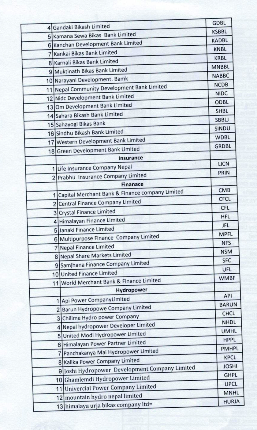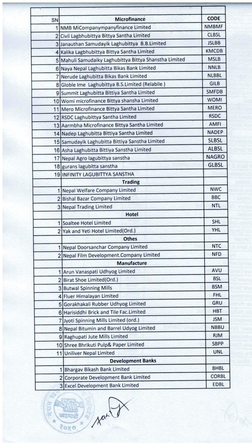 कारोबार रोक्का भएका कम्पनीहरुमा १९ वटा लघुवित्त कम्पनी, १८ वटा विकास बैंक, ३ वटा व्यापार कम्पनी, सोल्टी र याक एन्ड यति गरी २ वटा होटल, अन्य समूहका २ वटा कम्पनी र ११ वटा लघुवित्त कम्पनी छन् । यस्तै उत्पादन समूहका ११ वटा, जलविद्युत समुहका १३ वटा र बीमा समूहका २ वटा कम्पनी छन् ।