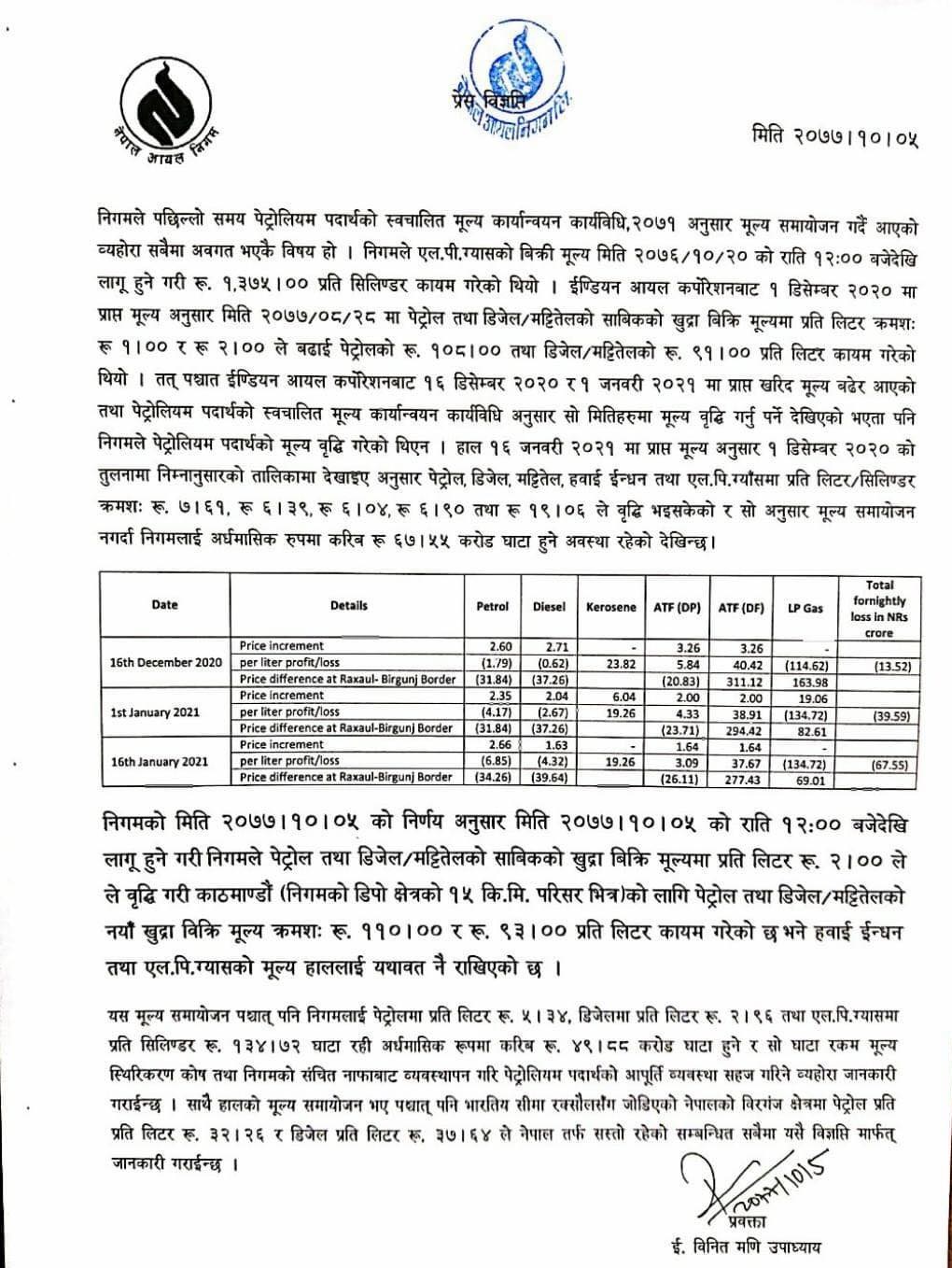 डेढ महिनाको अन्तरालमा इन्डियन आयल निगम (आईओसी) ले पठाएको मूल्य सूचीअनुसार सबै प्रकारका इन्धनमा ७-७ रुपैयाँ महँगो र एलपी ग्यास १९ रुपैयाँ महँगो भइसकेको छ। यसै कारणले मूल्य समायोजन गरिएको निगमले जनाएको छ।