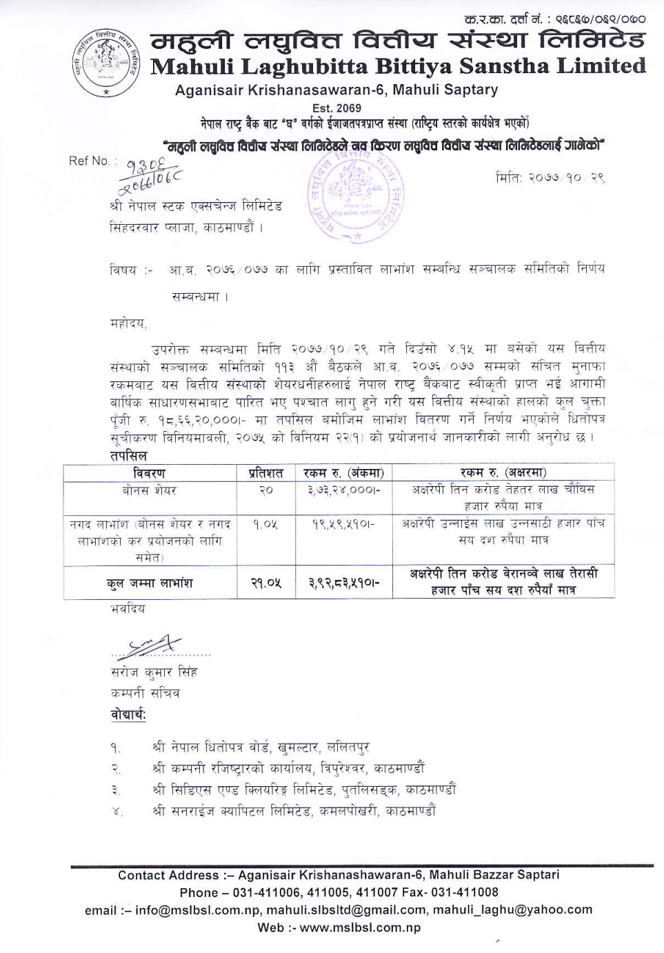 यसर्थ, कम्पनीले ३ करोड ७३ लाख २४ हजार रुपैयाँ बराबरको रकम बोनस वितरणमा खर्च गर्नेछ । यस्तै, १९ लाख ५९ हजार ५१० रुपैयाँ नगद लाभांश वितरणमा खर्च गर्नेछ। प्रस्तावित लाभांश नेपाल राष्ट्र बैंक र आगामी वार्षिक साधारण सभाले अनुमोदन गरेपछि वितरण हुन कम्पनीले जनाएको छ। गत वर्ष कम्पनीले ३१.५८% लाभांश दिएको थियो।