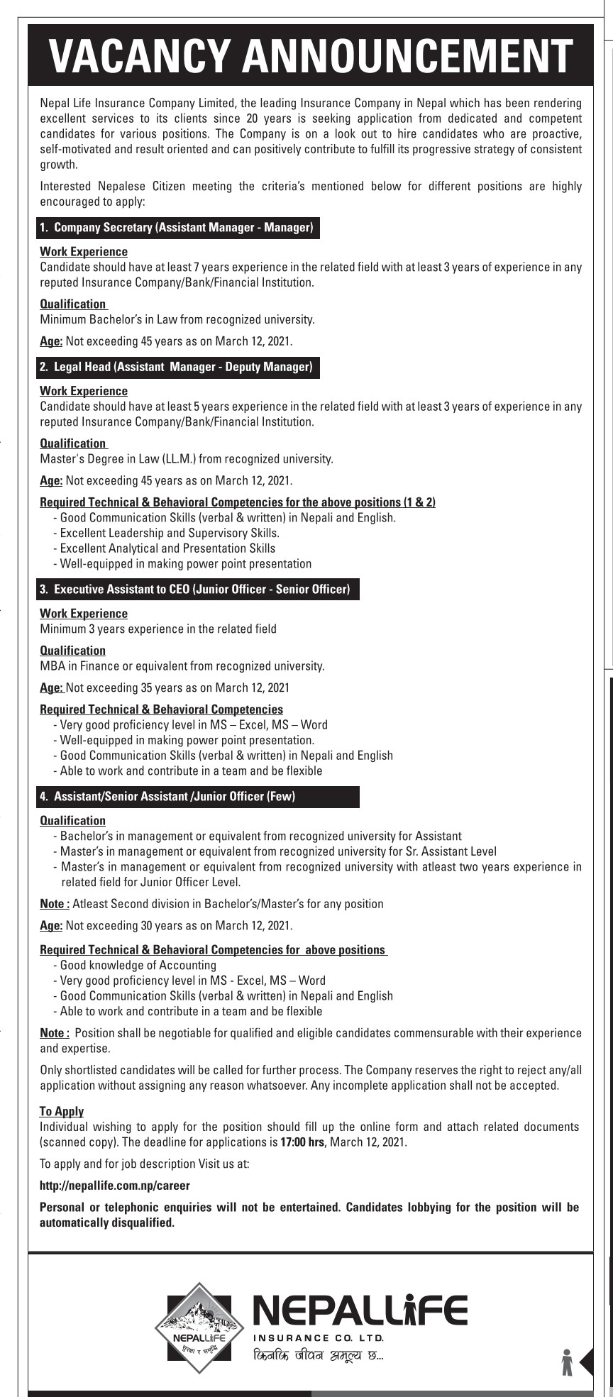काठमाडौं। नेपाल लाइफ इन्स्योरेन्सले विभिन्न पदका लागि कर्मचारीको माग गरेको छ। कम्पनीले एक विज्ञापन जारी गर्दै विभिन्न पदका लागि कर्मचारी माग गरेको हो। कम्पनीले सहायक प्रमुख, कानुनी प्रमुख, कार्यकारी सहायक र सहायक पदका लागी कर्मचारी माग गरेको हो। कम्पनीले सहायक प्रमुखको लागी सम्बन्धी काममा ७ वर्षको अनुभव भएको र कम्तीमा पनि ३ वर्ष कुनै पनि कम्पनी,बैंक वा फाइनान्समा काम गरेको अनुभव हुनुपर्ने बताएको छ। आवेदक कम्तीमा पनि कानुनमा स्नातकोत्तर गरेको हुनुपर्नेछ भने उमेर ४५ बर्षभन्दा कम हुनुपर्नेछ।