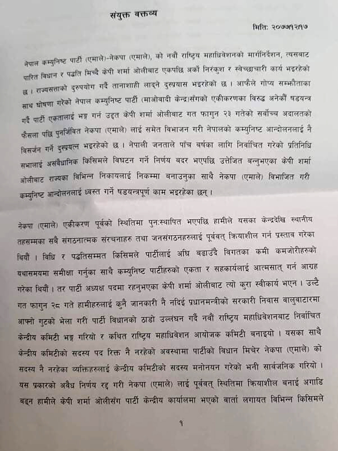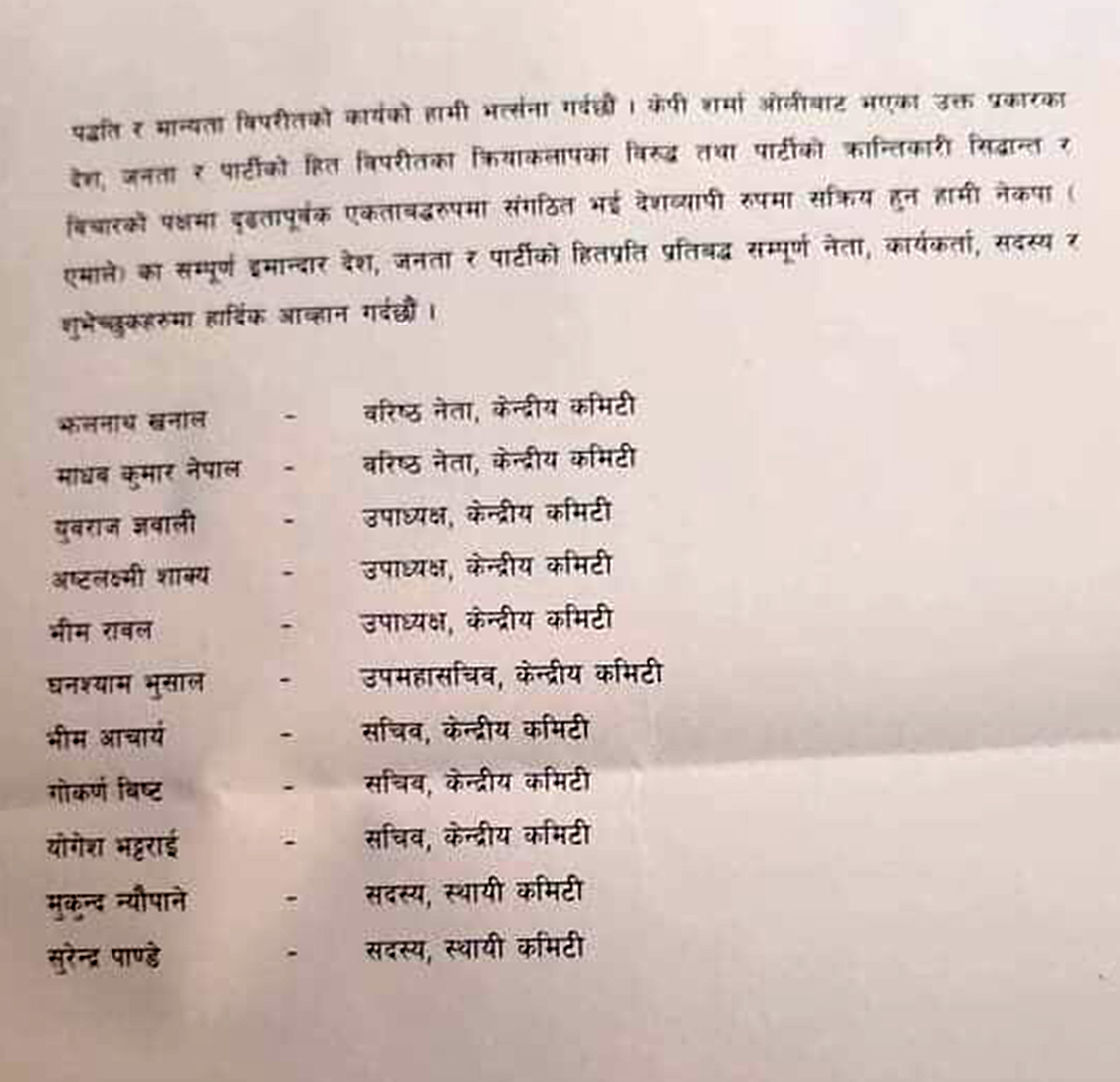 ओलीबाट भएका उक्त प्रकारका देश, जनता र पार्टी हितविपरीतका क्रियाकलापविरुद्ध तथा पार्टीको क्रान्तिकारी सिद्धान्त र विचारको पक्षमा दृढतापूर्वक संगठित भई देशव्यापी रुपमा सक्रिय हुन उनीहरुले देशभरका नेता कार्यकर्तालाई आग्रह गरेका छन्। नेताहरु झलनाथ खनाल, माधवकुमार नेपाल, युवराज ज्ञवाली, अष्टलक्ष्मी शाक्य, भीम रावल, घनश्याम भुसाल, भीम आचार्य, गोकर्ण बिस्ट, योगेश भट्टराई, मुकुन्द न्यौपाने र सुरेन्द्र पाण्डेले संयुक्त वक्तव्य जारी गरेका हुन्।