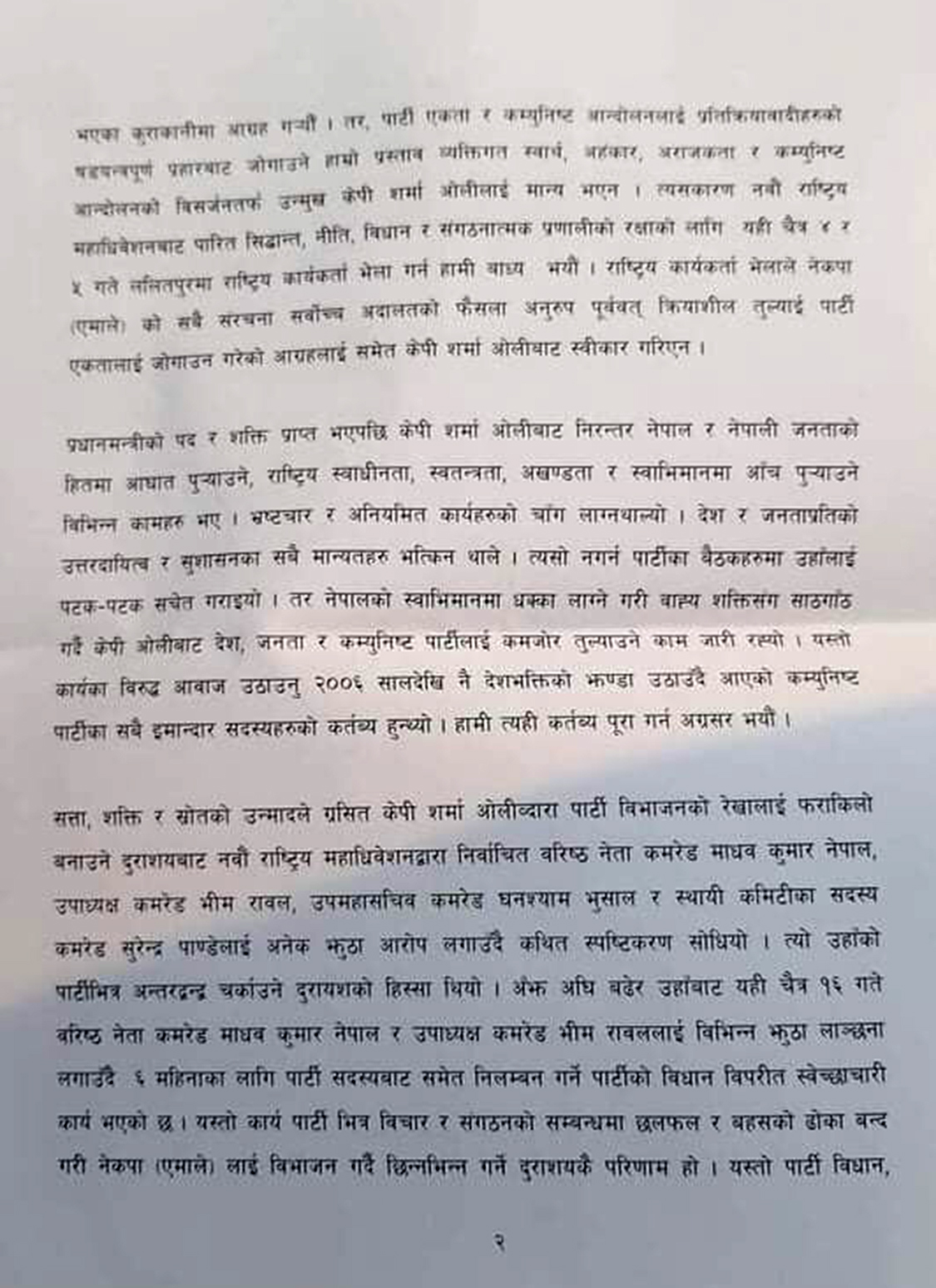 नेता नेपाल र उपाध्यक्ष भीम रावललाई गरिएको ६ महिनाको निलम्बन पार्टीभित्र विचार र संगठनको सम्बन्धमा छलफल र बहसको ढोका बन्द गरी नेकपा एमालेलाई विभाजन गर्दै छिन्नभिन्न गर्ने दुराशयको परिणाम भएको बताएको नेपाल-खनाल पक्षको ठहर छ। अध्यक्ष ओलीले कम्युनिष्ट आन्दोलनलाई ध्वस्त पार्न लागेको आरोप लगाइएको छ।