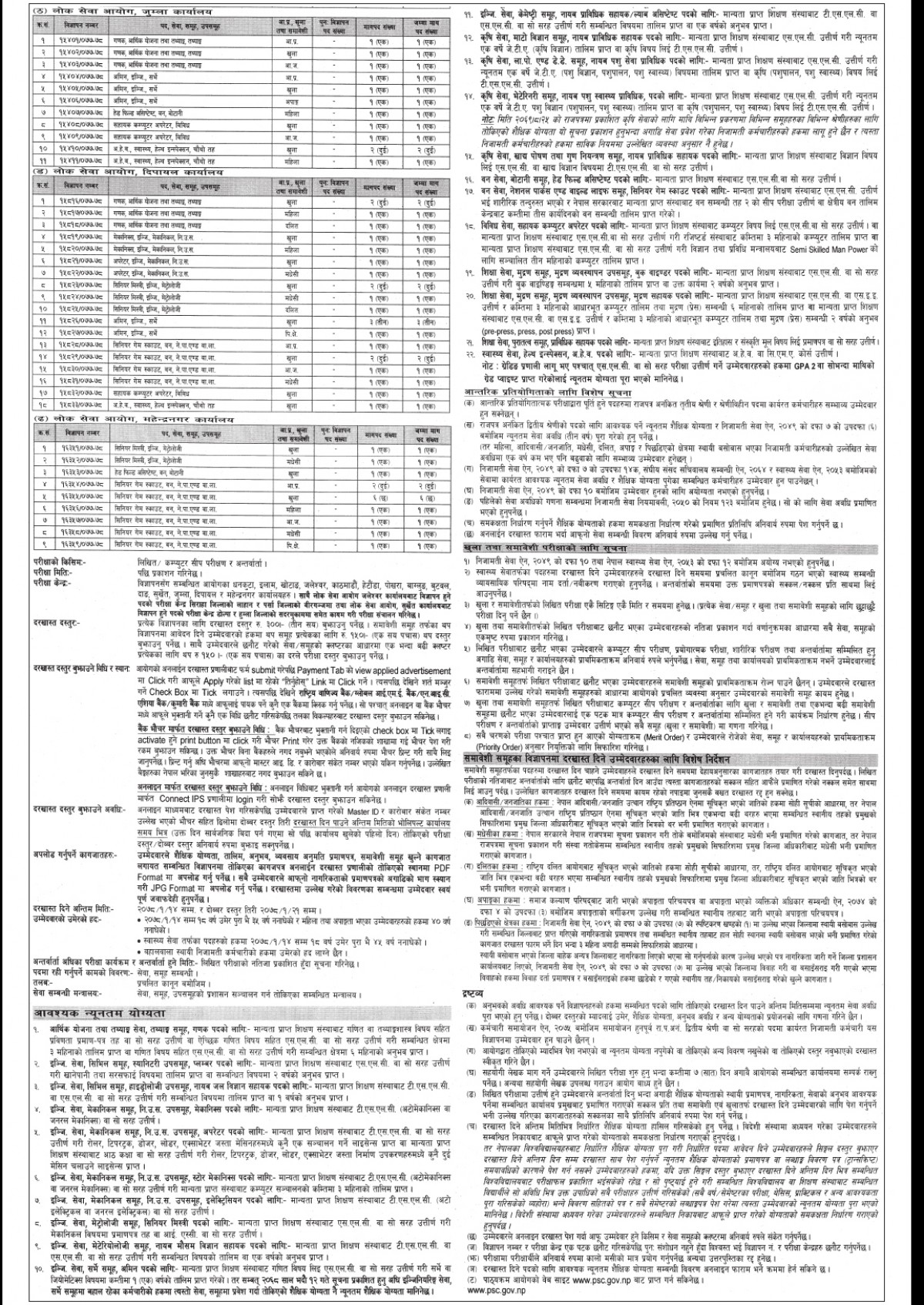 आयोगका कार्यालयहरू इलाम‚ धनकुटा, खोटाङ, जलेश्वर, काठमाडौं, हेटौंडा, पोखरा, बागलुङ, बुटवल, दाङ, सुर्खेत, जुम्ला, दीपायल र महेन्द्रनगरले उक्त पदको माग गरेको हो। उक्त विभिन्न पदमा अनलाइनमार्फत पनि आवेदन दिन सकिने जनाइएको छ। आवेदनका लागि http://psconline.psc.gov.np/ मार्फत आवेदन दिन सकिने छ। आवेदन दिन १८ वर्ष पूरा भई ३५ वर्ष ननाघेका हुनु पर्नेछ।
