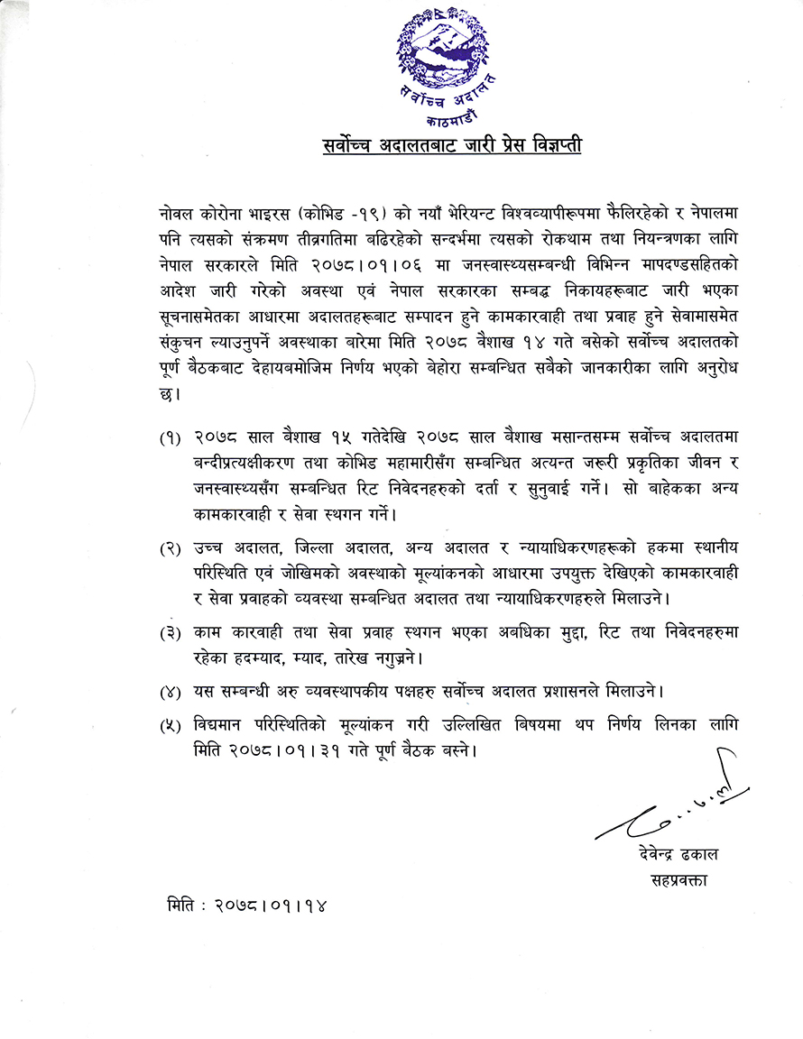 अन्य सेवा भने स्थगन गर्ने निर्णय भएको अदालतका सहप्रवक्ता देबेन्द्र ढकालले सूचनामार्फत जानकारी गराएका छन्। उच्च अदालत, जिल्ला अदालत, अन्य अदालत र न्यायाधीकरणहरुले स्थानीय परिस्थिति एवं जोखिमको अवस्था अनुसार निर्णय गर्न सक्ने सर्वोच्चले जनाएको छ। यो अवधिका मुद्दा, रिट तथा निवेदनहरुमा रहेको हद म्याद, म्याद, तारेख नगुज्रने भएको छ। यो अवधिको मूल्यांकन गरी वैशाख ३१ गते सर्वोच्चको पूर्ण बैठक बसेर थप निर्णय गर्ने भएको छ।