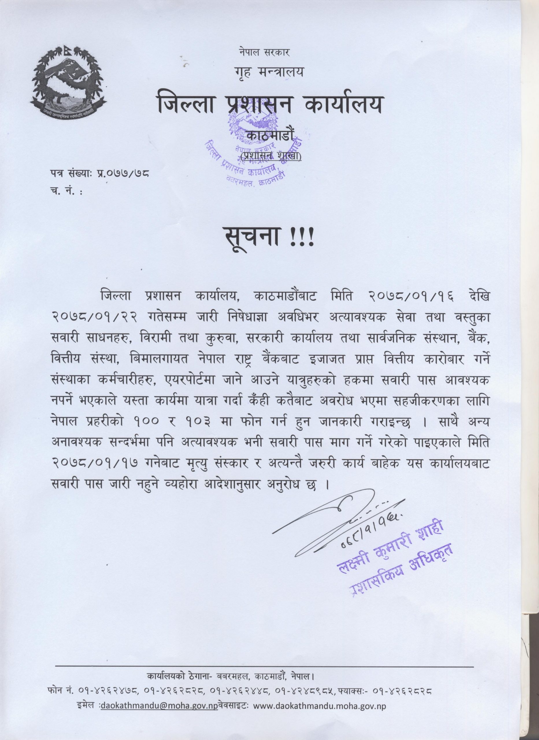 यस्तो अवस्थामा कहीँ कतैबाट अवरोध तथा असहयोग भएमा नेपाल प्रहरीको १०० र १०३ मा सम्पर्क गर्न सबैमा अनुरोध गरिएको छ।