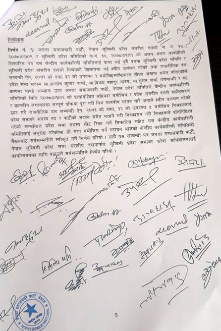 काठमाडौं। लुम्बिनी प्रदेशका आफ्ना चार सांसदलाई कारबाहीका लागि जनता समाजवादी पार्टीका २६ जना केन्द्रीय कार्यकारिणी समिति सदस्यले हस्ताक्षर गरेको पाइएको छ। जसपाका अध्यक्ष उपेन्द्र यादव र संघीय परिषद् अध्यक्ष डा. बाबुराम भट्टराई पक्षधरले बहुमत पुर्याएर सांसदलाई कारबाही गरिएको पत्र प्रदेशसभा सचिवालयमा दर्ता गराएका थिए।