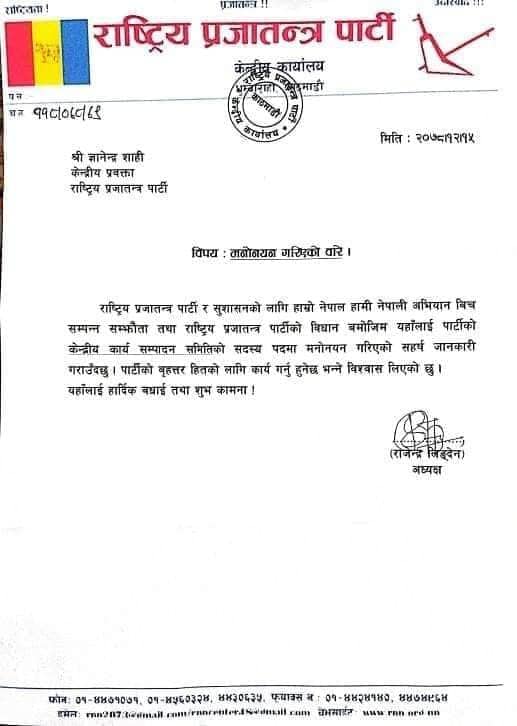 काठमाडौं। राष्ट्रिय प्रजातन्त्र पार्टी (राप्रपा)को केन्द्रीय कार्य सम्पादन समितिको सदस्यमा ज्ञानेन्द्र शाही मनोनीत भएका छन्। अध्यक्ष राजेन्द्र लिङ्देनले प्रवक्ता शाहीलाई पार्टीको कार्यसम्पादन समितिमा मनोनीत गरेका हुन्। यो प्रवक्ताभन्दा माथिल्लो जिम्मेवारी हो।