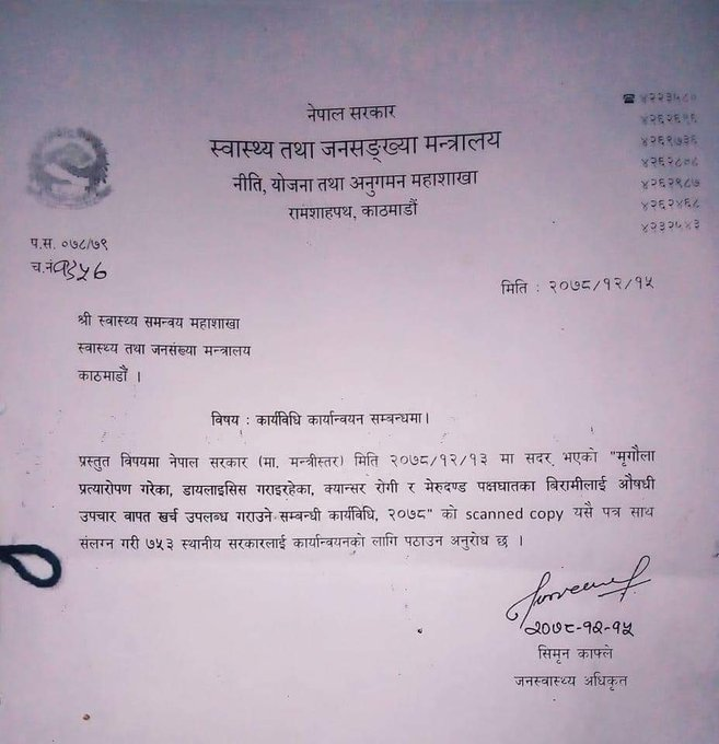 काठमाडौं। गम्भीर रोग लागेका बिरामीलाई औषधि उपचार लागि मासिक ५ हजार रुपयौँ उपलब्ध गराउने निर्णय लागू भएको छ। स्वास्थ्य तथा जनसंख्या मन्त्रालयको चैत १३ को मन्त्रीस्तरको सोव रकम उपलब्ध गराउन निर्णय कार्यान्वयन भएको हो।