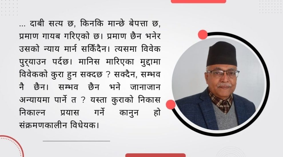 संक्रमणकाल आफैमा विवादित काल हो। दाबी सत्य छ, किनकि मान्छे बेपत्ता छ, प्रमाण गायब गरिएको छ। प्रमाण छैन भनेर उसको न्याय मार्न सकिँदैन। त्यसमा विवेक पुर्‍याउन पर्दछ। मानिस मारिएका मुद्दामा विवेकको कुरा हुन सक्दछ ? सक्दैन, सम्भव नै छैन। सम्भव छैन भने जानाजान अन्यायमा पर्ने त ? यस्ता कुराको निकास निकाल्न प्रयास गर्ने कानुन हो सङ्क्रमणकालीन विधेयक।
