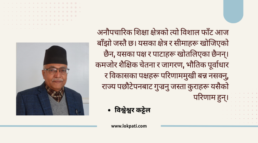 अनौपचारिक शिक्षा क्षेत्रको त्यो विशाल फाँट आज बाँझो जस्तै छ। यसका क्षेत्र र सीमाहरू खोजिएको छैन, यसका पक्ष र पाटाहरू खोतलिएका छैनन्। कमजोर शैक्षिक चेतना र जागरण, भौतिक पूर्वाधार र विकासका पक्षहरू परिणाममुखी बन्न नसक्नु, राज्य पछौटेपनबाट गुज्रनु जस्ता कुराहरू यसैको परिणाम हुन्। यसको मर्म मूल्य र मान्यता न त बुझाउने बुझाउन सकेको छ, न त बुझ्नेले बुझ्न सकेको छ। किनकि, अनौपचारिक क्षेत्रले प्राथमिकता पाउनु भनेको, त्यो देशको आर्थिक सामाजिक राजनैतिक हैसियतमा वृद्धि हुनु पनि हो। र, समाज आफ्नोपन बोकेको आधुनिक सभ्यतातर्फ लम्कनु हो।