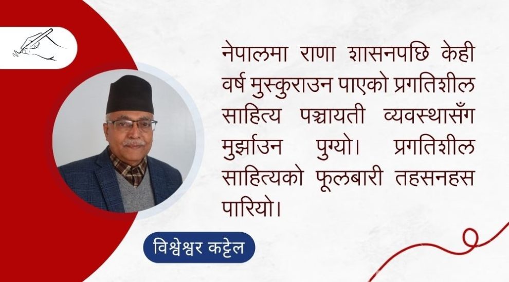 नेपालको प्रगतिशील साहित्यको इतिहास हेर्दा पनि राणा शासनपछि केही वर्ष मुस्कुराउन पाएको साहित्य पञ्चायती व्यवस्थासँग मुर्झाउन पुग्यो। प्रगतिशील साहित्यको फूलबारी तहसनहस परियो। कुना कन्दराहरू फुलेका फूलहरूले साहित्य फाँटमा उपस्थिति देखाउन सकेपनि आम जनतामा धार्मिक अन्धकारभित्र सशक्त चेतनाको ज्योति लिएर जान सकेन। र, पनि प्रगतिशील गीतले क्रान्तिका भाका गाउन छोडेन। प्रगतिशील साहित्यले जनताको पक्षमा लेख्न छाडेन। आज पनि यहीक्रम निरन्तर छ। समय सापेक्ष घटबढ वा स्वरूपमा परिवर्तन होला, तर पद्धतिमा परिवर्तन पाइँदैन।