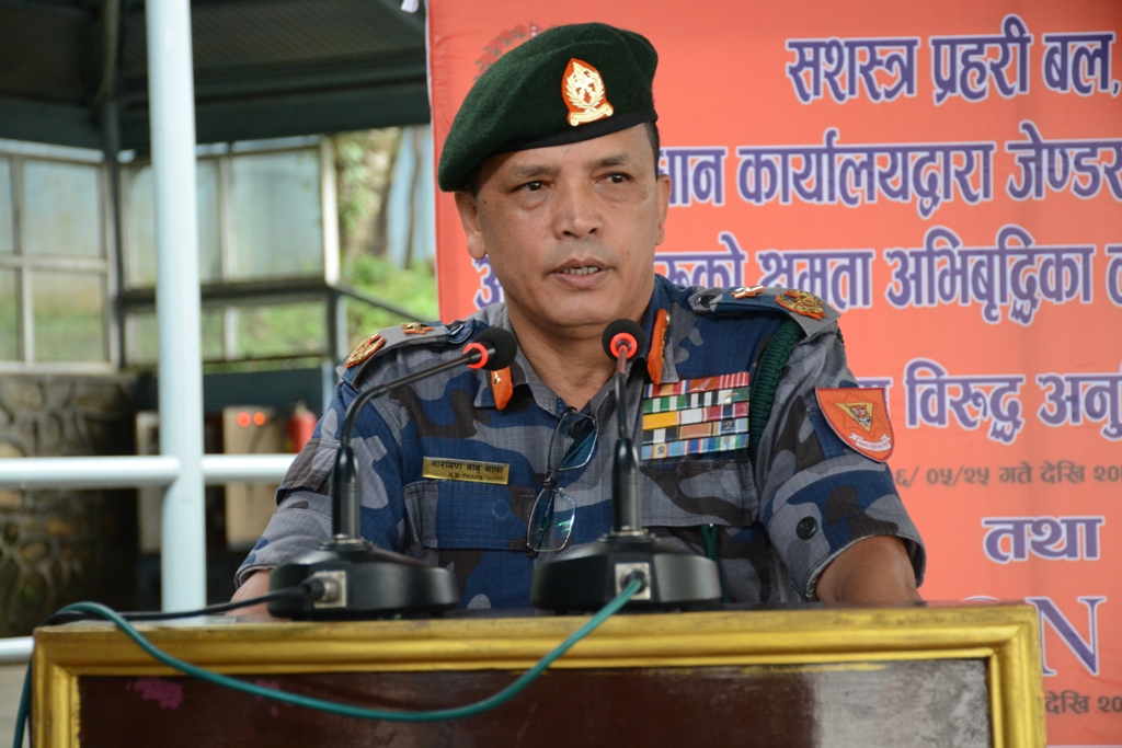 काठमाडौं, ९ असोज। सशस्त्र प्रहरी प्रहरी अतिरिक्त महानिरीक्षक नारायणबाबु थापाले सशस्त्र प्रहरी बल, नेपाल प्रधान कार्यालय हल्चोक स्वयम्भुमा संचालित लैंगिक हिंसा बिरुद्ध अनुशिक्षण तालीमको समापन गरेका छन्।