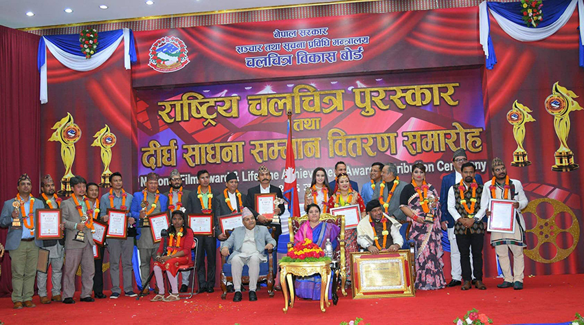 काठमाडौं, २८ असार । राष्ट्रपति विद्यादेवी भण्डारीबाट शुक्रबार तीन दर्जन चलचित्रकर्मीहरु सम्मानित भएका छन् । चलचित्र विकास बोर्डले आफ्नो १९ औं स्थापना दिवसको अवसर पारेर चलचित्रकर्मीहरुलाई सम्मान गरेको हो ।